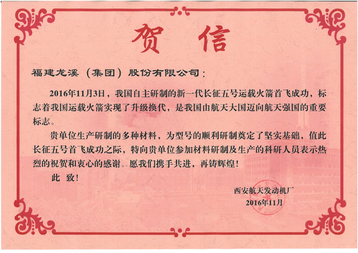 近日,西安航天發動機廠發來賀信,感謝公司生產研制的多種材料,為新一代“長征五號”運載火箭某型發動機的順利研制奠定了堅實基礎,對公司參與材料研制及生產的科研人員表示熱烈祝賀和衷心感謝,并希望日后能與公司攜手共進,再鑄輝煌。