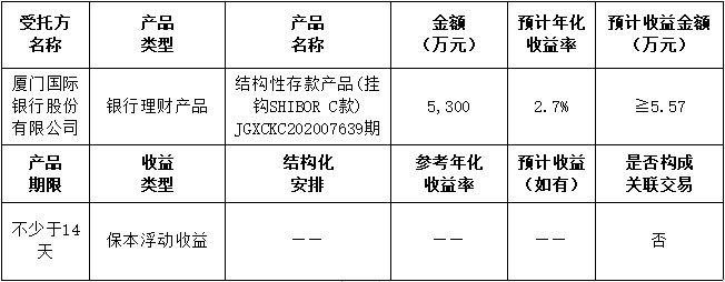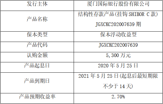 委托理財期限:廈門國際銀行委托理財產品期限為:2020年5月25日~ 2021年5月25日 (起息后最短期限不少于14天)。