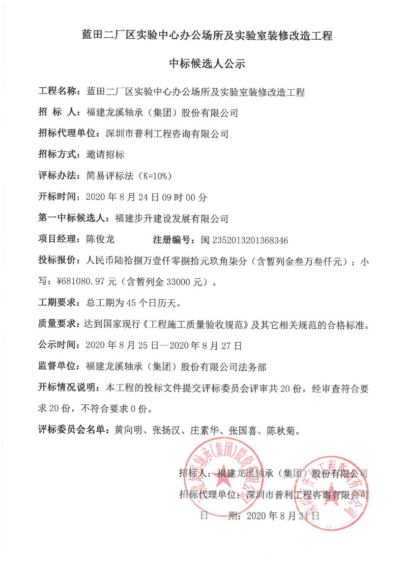 龍軸集團藍田二廠區(qū)實驗中心辦公場所及實驗室裝修改造工程中標候選人公示