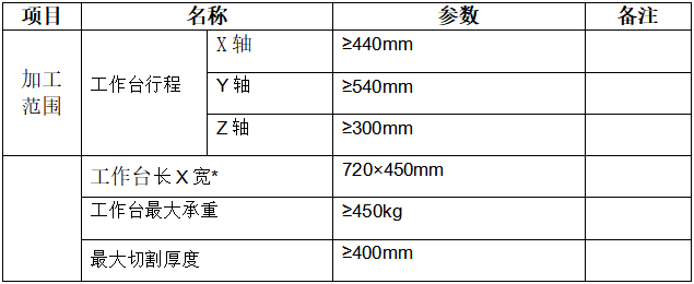 (1)設備功能要求(關注工作臺長X寬為720×450mm以上,最大切割厚度大于400 mm)