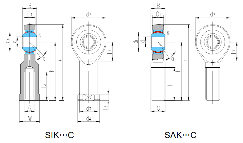 軸 承 型 號 Bearing number 外 形 尺 寸 Dimensions mm 額定載荷 Load ratings kN 重量 Weight ≈kg d B dk C1 max d2 G 6g h l1 min l2 l7 rs min αº ≈ 動載荷 Dynamic 靜載荷 Static SAK5C 5 8 11.112 6 19.5 M5 33 19 42.8 — 0.3 4 3.6 3.9 0.017 SAK6C 6 9 12.7 7.5 21.2 M6 36 21 46.7 — 0.3 9 4.7 5.2 0.023 SAK8C 8 12 15.88 9.5 25.5 M8 42 25 54.8 — 0.3 12 7.6 8.2 0.047 SAK10C 10 14 19.05 11.5 31 M10 48 28 63.6 — 0.3 10 12 15 0.085 SAK12C 12 16 22.23 12.5 34 M12 54 32 71 — 0.3 12 14 19 0.12 SAK14C 14 19 25.4 14.5 38 M14 60 36 79 — 0.3 14 19 24 0.17 SAK16C 16 21 28.58 15.5 42 M16 66 37 87 — 0.3 14 23 29 0.23 SAK18C 18 23 31.75 17.5 46 M18×1.5 72 41 95 — 0.6 13 29 34 0.31 SAK20C 20 25 34.93 18.5 50 M20×1.5 78 45 103 27.5 0.6 14 34 40 0.40