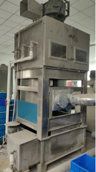 5)設備的水除塵采用專用水噴淋除塵設備。整體應采用不銹鋼制造,含支架、外殼及內部過濾網。空氣由下部通入,上部出氣(下行的水管應深入水箱底部,再讓水流溢流至過濾網,必要時增加引風機,確保含塵氣體上逸。);底部設有水池,配有浮標,池中的水可自動補充,水池底部配有排污裝置,可將粉塵等沉淀物排出;系統配有獨立開關,可控制除塵的啟停;箱內過濾的濾網采用不銹鋼濾網并在隔層內加裝吸塵小球,噴水閥采用消防噴水頭。具體樣式參照我司現有水除塵設備樣式,如下圖: