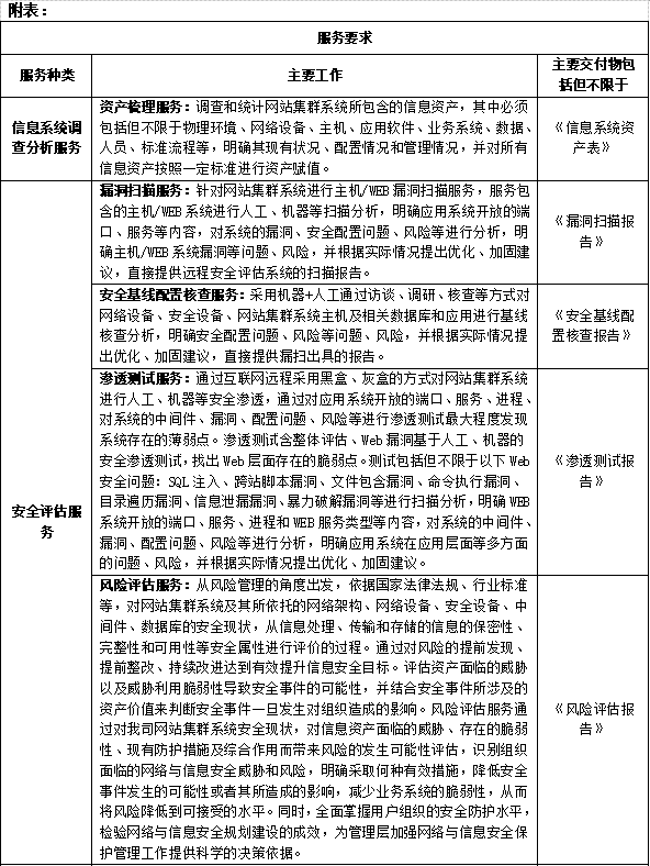 報名方式:郵箱報名,參與投標的申請人須將公司的營業執照復件、 信息安全風險評估服務資質認證證書、信息安全應急處理服務資質證書及2020年1月至今與本項目相同或相類似的銷售業績加蓋公章,發至采購人指定郵箱,并注明“門戶網站年度風險評估服務項目報名資料、公司名稱、項目聯系人姓名、聯系方式”。