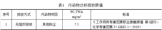 砂帶機(jī)產(chǎn)生的粉塵經(jīng)處理后達(dá)到《大氣污染物排放標(biāo)準(zhǔn)》(GB16297-1996)表2二級(jí)標(biāo)準(zhǔn)要求,即顆粒物排放濃度≤120mg/m3,尾氣接至窗戶外,同時(shí)增加百葉窗裝飾。同時(shí),車間內(nèi)無組織排放粉塵能符合《工作場(chǎng)所有害因素職業(yè)接觸限值 第1部分:化學(xué)有害因素》(GBZ2.1-2019)相應(yīng)標(biāo)準(zhǔn)要求,具體見下表1。