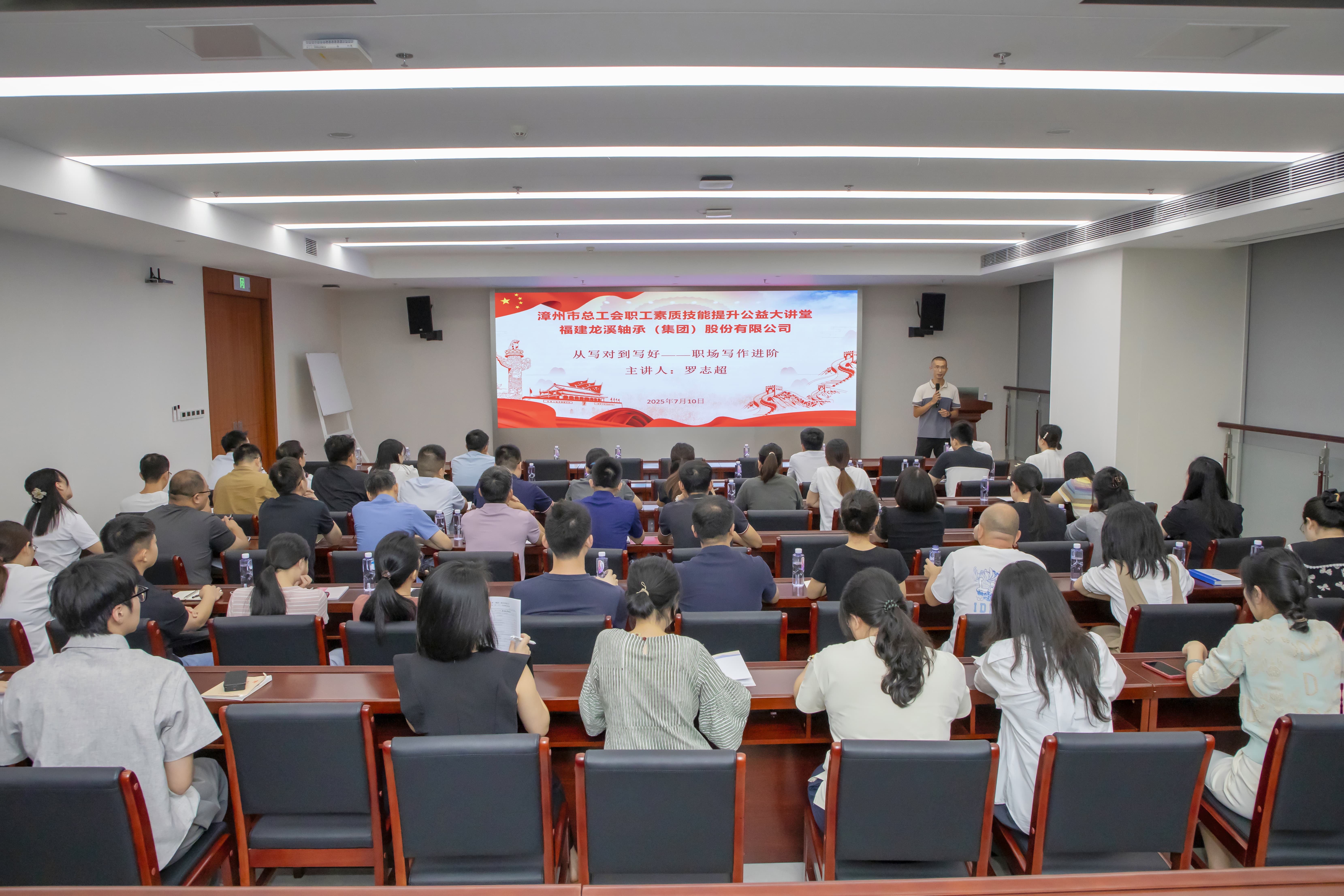 為進一步提升員工綜合素養,助力龍軸集團高質量發展。在漳州市總工會的大力支持下,公司于7-8月組織兩場員工素質提升公益大講堂專題培訓,邀請閩南師范大學新聞傳播學院副教授、碩士生導師羅志超和漳州理工職業學院衛生健康學院講師許淵能分別講授“從寫對到寫好-職場寫作進階”和“高品質溝通技巧與社交”課程,相關職能部門人員參加培訓。