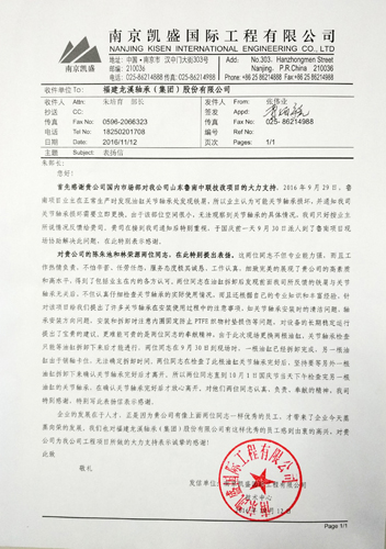 近日,一封表揚信寄到了公司國內(nèi)市場部。原來,為感謝公司技術(shù)員陳朱池、林榮源提供的細致貼心的技術(shù)服務(wù),南京凱盛國際工程有限公司(下稱南京凱盛)特意寄來了這封表揚信。
