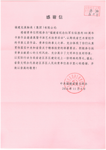 近日,一封感謝信寄到了公司。原來,為感謝公司積極參與“福建省紀念紅軍長征勝利80周年書畫作品邀請展暨書畫藝術(shù)扶貧活動”,認購我省藝術(shù)家書畫義賣作品,為我省老區(qū)蘇區(qū)建設(shè)貢獻一份力量,省委文明辦特意寄來了這封感謝信。