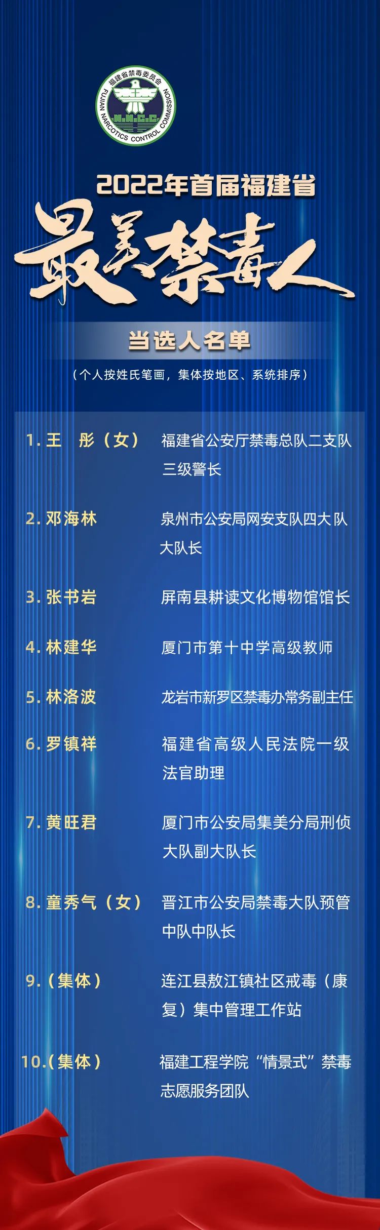 按照《關(guān)于組織開展全省首屆“最美禁毒人”宣傳推選活動(dòng)的通知》要求,經(jīng)基層推薦、組織初審、網(wǎng)絡(luò)投票、專家評(píng)審等程序,中共福建省委宣傳部、福建省禁毒委員會(huì)辦公室確定了2022年首屆福建省“最美禁毒人”10名當(dāng)選人、10名提名獎(jiǎng)獲得者最終獲評(píng)名單?,F(xiàn)將名單予以公示,接受監(jiān)督。如有異議,請(qǐng)?jiān)诠酒谙迌?nèi),通過(guò)來(lái)信、來(lái)電等方式,實(shí)名反映情況。