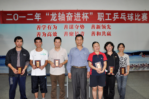此外,在三、四名對決中,楊益斌、林衛(wèi)東分別獲得女單、男單第三名。最后,公司黨委副書記、工會主席張?zhí)┥鸀楂@獎選手頒發(fā)獎狀,乒乓球賽圓滿落幕。