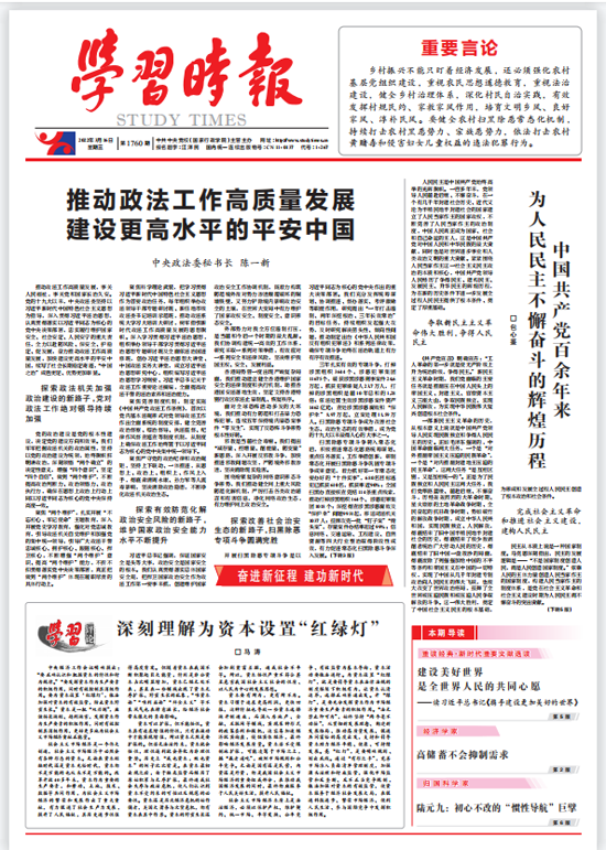 3月16日,學習時報頭版頭條刊發中央政法委秘書長陳一新關于推動政法工作高質量發展建設更高水平的平安中國的署名文章,從探索政法機關加強政治建設的新路子、探索有效防范化解政治安全風險的新路子、探索改善社會治安生態的新路子、探索加快社會治理現代化的新路子、探索完善中國特色社會主義政法制度體系的新路子、探索政法服務黨和國家工作大局的新路子、探索打贏政法領域意識形態斗爭主動仗的新路子、探索推進政法戰線自我革命的新路子等八個方面進行了系統闡述。
